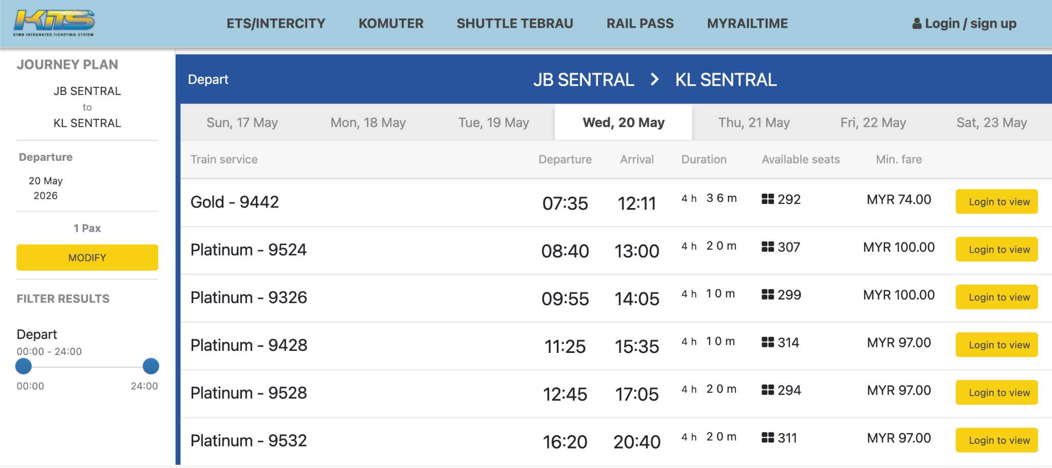 - There are far more Platinum trains per day on the JB-KL route. For instance, in March 2026, only one Gold train departed from JB each day.