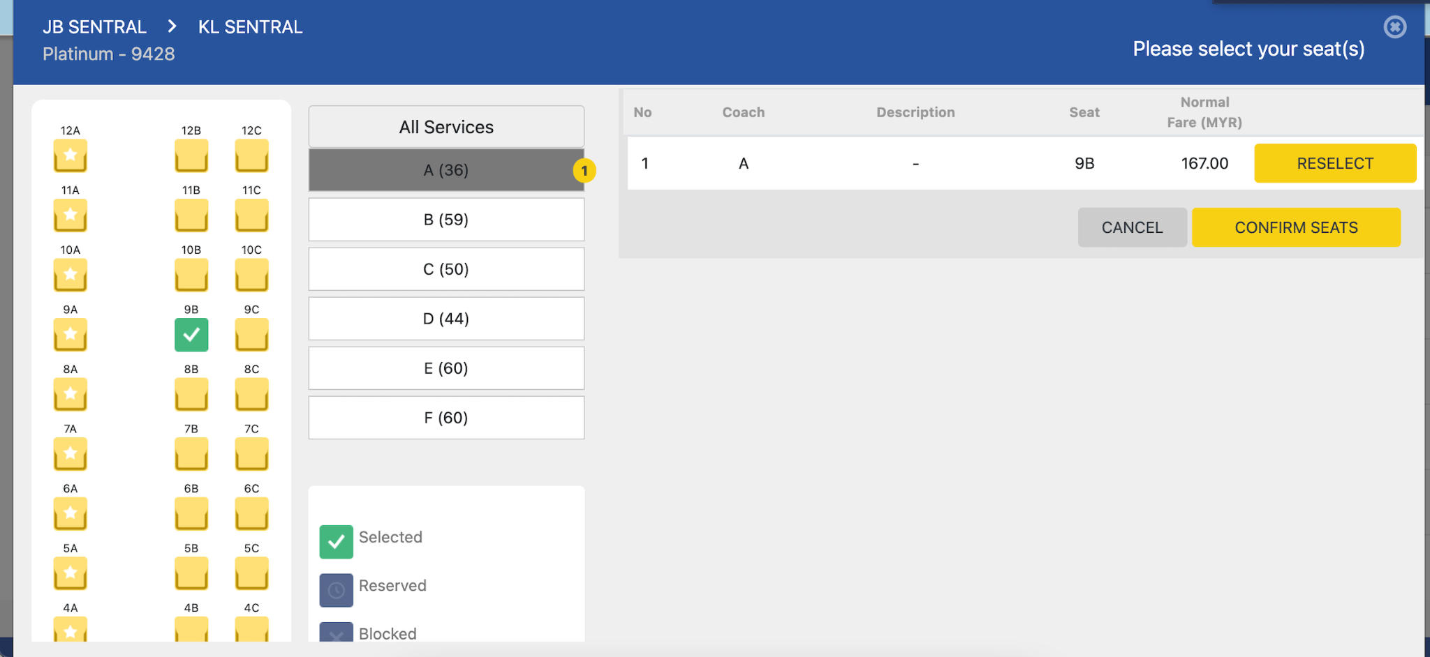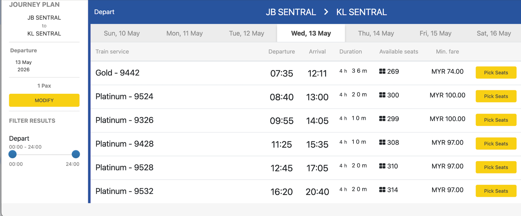 Right now, you typically find only Gold and Platinum trains plying the JB-KL route, with a travelling time of 4 hours 40 minutes and 4 hours 20 minutes, respectively. Note that Business Class is only available on Platinum trains.