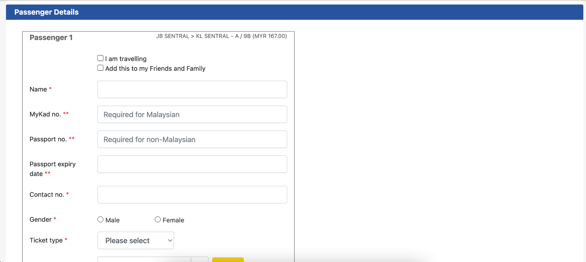 3) Enter your origin (JB SENTRAL), destination (KL SENTRAL), departure date, return date (if applicable), number of passengers, and click [SEARCH].