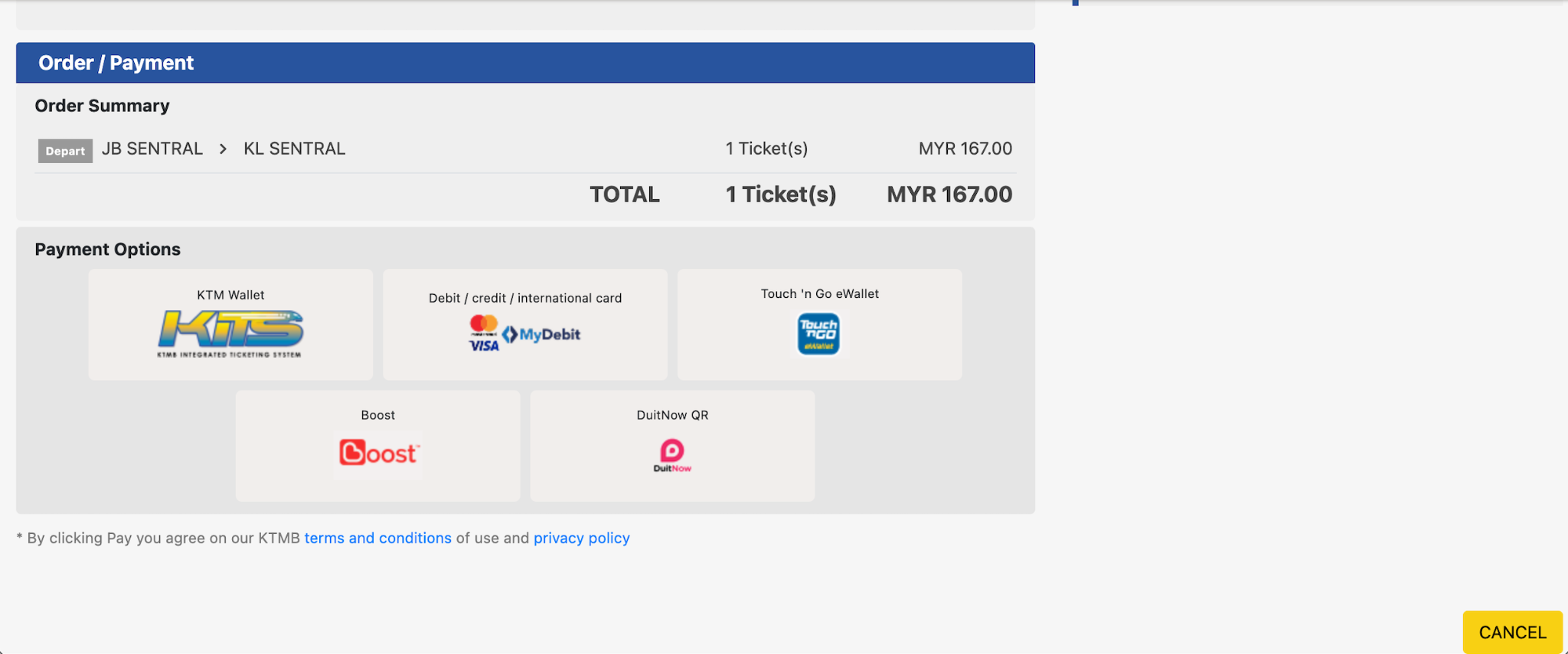 7) Pay by Visa, Mastercard, MyDebit, Touch ‘n Go eWallet, Boost, DuitNow QR or KTM Wallet.